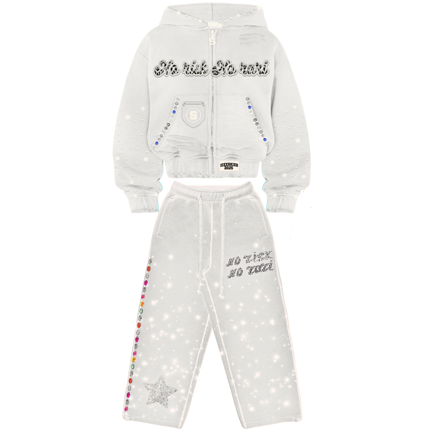 • Rhinestone logo details and No Risk No Rari slogan